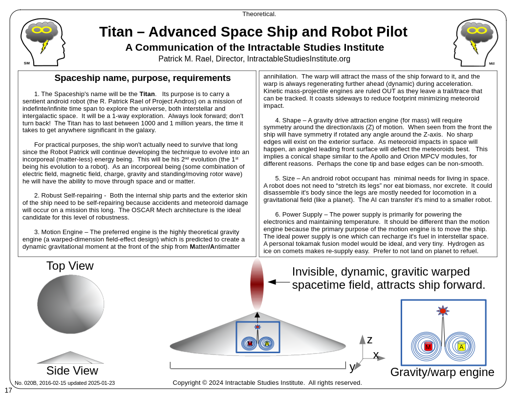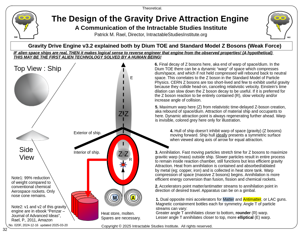 Peralta, NM US March 20, 2025: Following his January 23, 2025 announcement of the reverse engineering (from reports only) of the three famous UAP/UFO videos of flying saucers/craft, Patrick Rael does it again. Version 3.2 of the gravity drive engine solves the challenge that v3.1 required two mini-accelerators (table-top size) or LAC (Linear ACcelerator) guns to shoot dual streams of matter/antimatter to an intersection point at nearly the speed of light C. Version 3.2 eliminates this requirement, the entire reaction can occur inside the ablation chamber, but it will be less efficient than v3.1. Still, less-efficient still has gravity attraction because the warp of space is dynamic and detached from material. Solving this leaves only 1 outstanding challenge for the Gravity Drive engine: a source of antimatter.