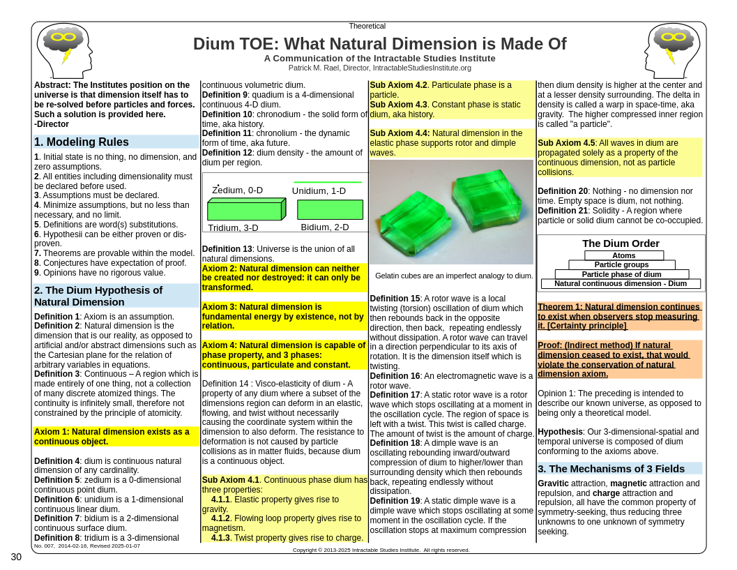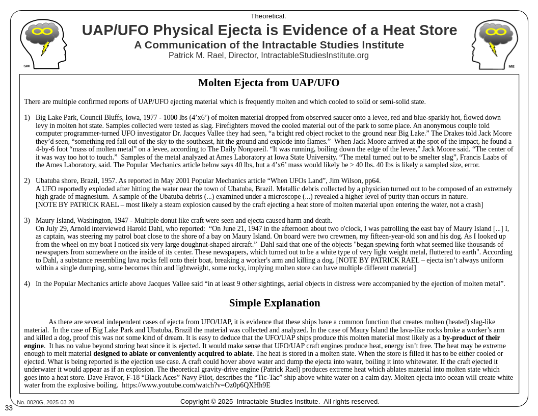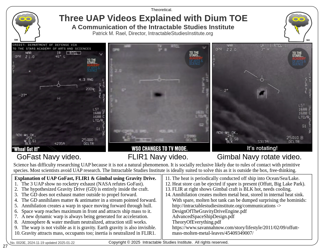 Peralta, NM US January 23, 2025: Patrick Rael, Director of the Intractable Studies Institute in Peralta, NM, USA, reverse engineers the flying saucer propulsion/attraction mechanism from reports only. Using three famous US Navy Pilot video/audio recordings and reports of molten metal being dropped from a UFO in Big Lake Park, Council Bluffs IA, 1977, the mechanism of craft motion is now understood and makes sense. Using his own Dium TOE, a slightly different "lower-level" model than the Standard Model of Particle Physics and Relativity, he solves this and then ties it into the Z boson of the Standard Model. This is still theoretical, not yet proven, and scientists and researchers are invited to apply critical analysis to it. Matter-antimatter annihilation in forward motion is the key, relativistic time dilation slowing down the annihilation warp of space before it rebounds (the Z bosons decay).